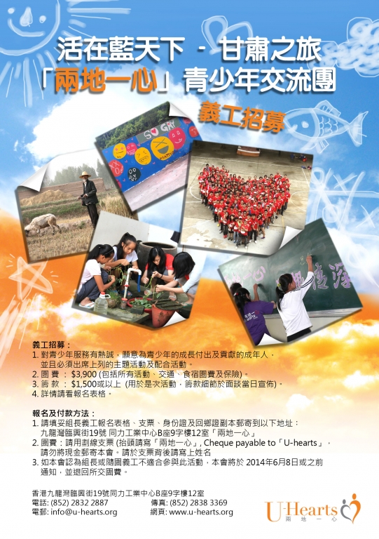 「兩地一心」每年暑假致力筹办青少年交流团。在2014年的夏天我们将带领香港青少年到西北甘肃山区,亲身体验当地生活及学习环境,为兩地青少年创造互动交流空间,透过家访、农务、服务活动等。